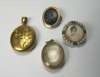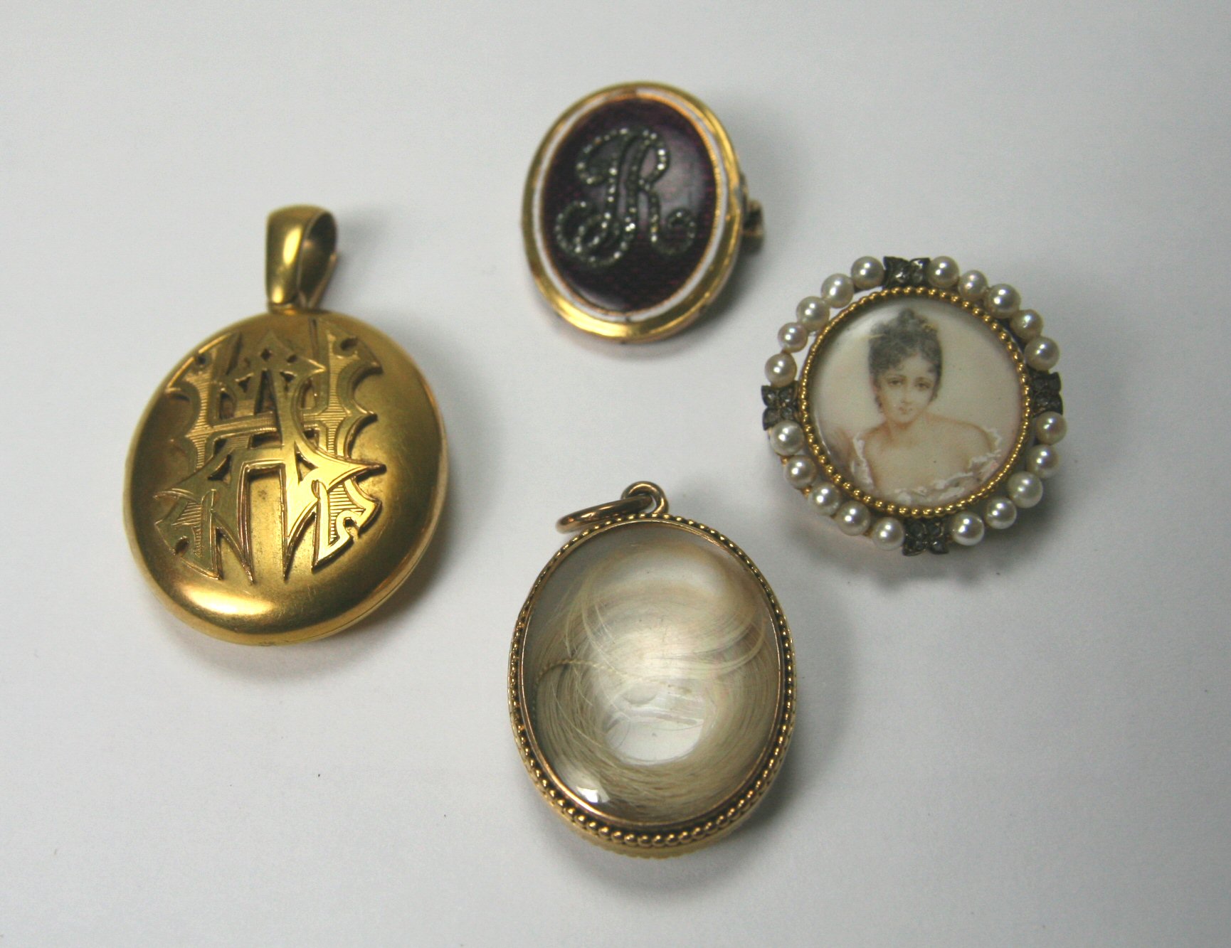 with central hand-painted female portrait miniature; an oval memorial brooch, applied with a rose cut diamond monogram, to a purple guilloche enamelled ground within a white enamelled border, with glazed panel containing hair scrolls to reverse; a glazed oval locket, also containing hair scrolls and another locket with applied monogram (4)