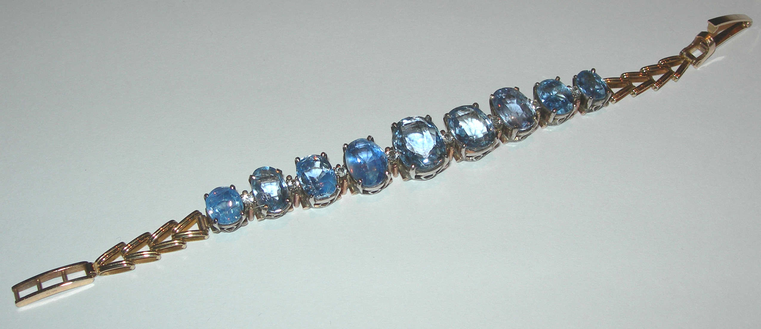 composed of open chevron form links, claw set to the front with nine graduated oval cut sapphires, interspersed by smaller circular cut colourless sapphires, with fold-over clasp