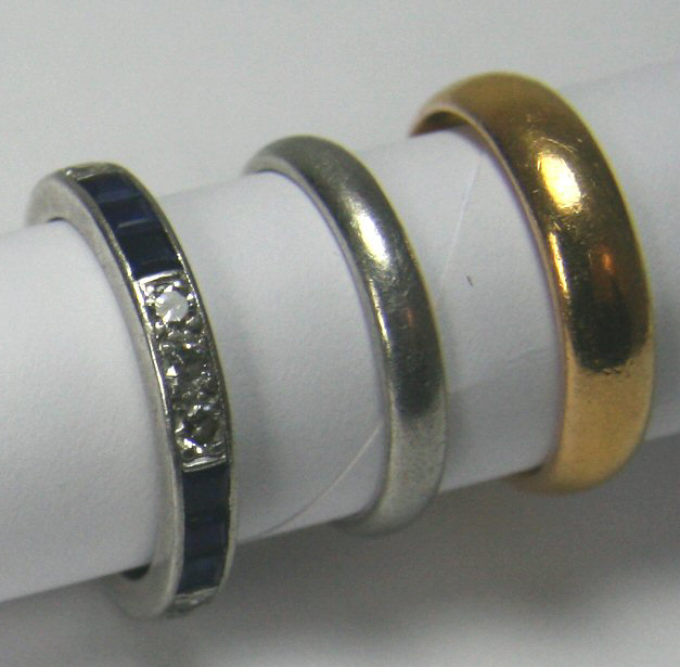 channel set with square cut sapphires and round brilliant cut diamonds; a platinum wedding band; also a 22ct gold wedding band (3)