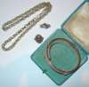to include a modern 9ct gold mounted amethyst and diamond set ring; a 9ct gold mounted oval cut smoky quartz set ring; an early 20th century 9ct rose gold foliate engraved hinged bangle, with fitted case; together with a modern 9ct gold fancy link necklace (4)