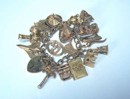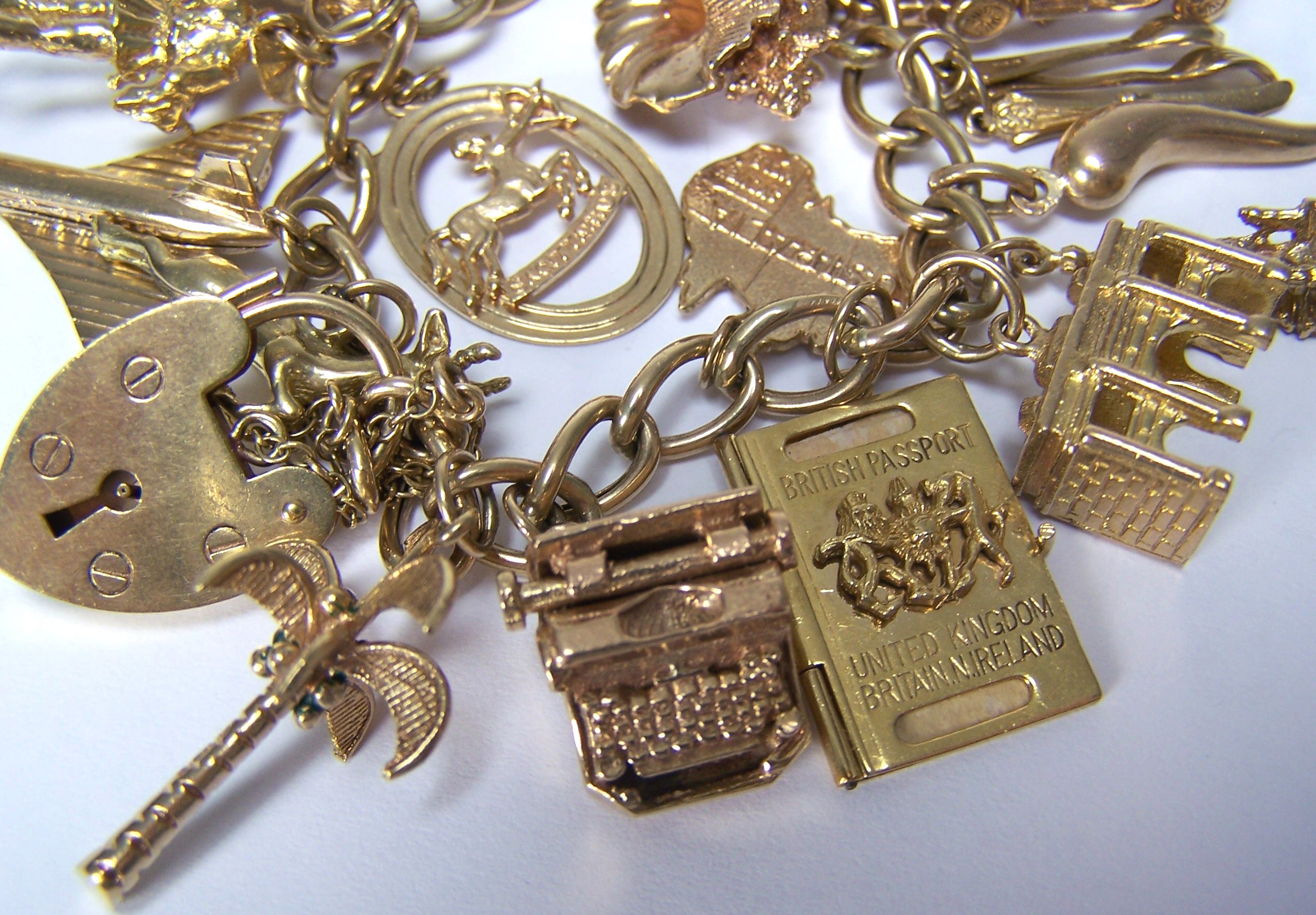 composed of curb links, with padlock clasp, suspending twenty assorted charms; also a 9ct gold MIZPAH ring (2)