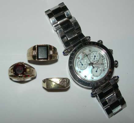 the mother-of-pearl circular dial with colourless gem set dot numerals, three subsidiary dials and curved rectangular date aperture, with circular cut blue cabochon set winder, flanked by similarly set push-buttons; together with three assorted gem set rings (4)