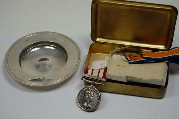 Notes: sold with accompanying letter to RNVR general service medal and armada dish, stating the armada dish was presented to D Burgess who ' so selflessly assisted so many of our young charges safely to evacuate the sinking Jupiter' and also stated he 'returned to the dining room of the stricken and badly listing vessel, to make sure no one was left behind.... and work checking the survivors in the appalling situation was critical to the whole repatriation'