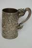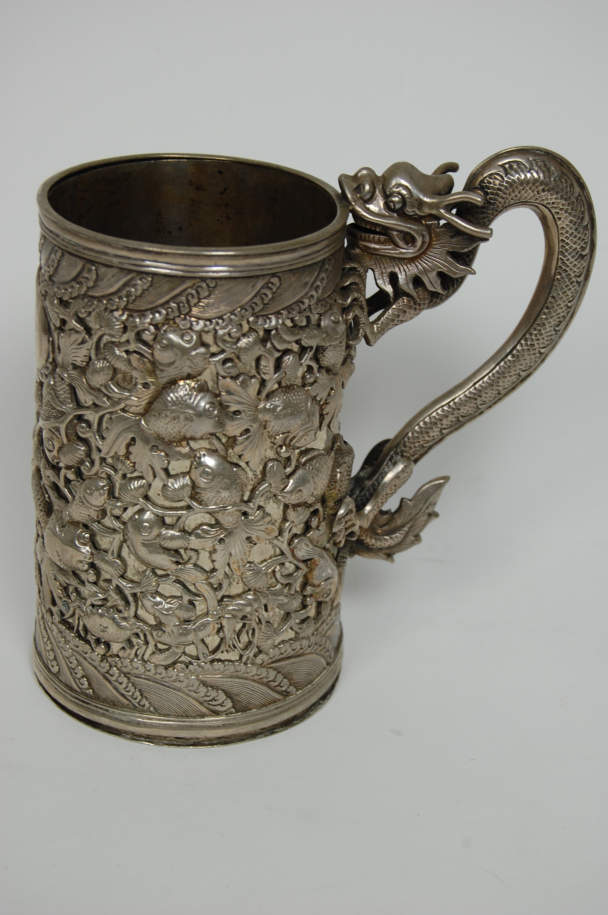 the tall slightly flared can form mug with overlaid pierced and embossed decoration of fish and sea creatures, with simple moulded rim and foot, the S scroll handle well formed as a dragon, with character mark and C.W to base