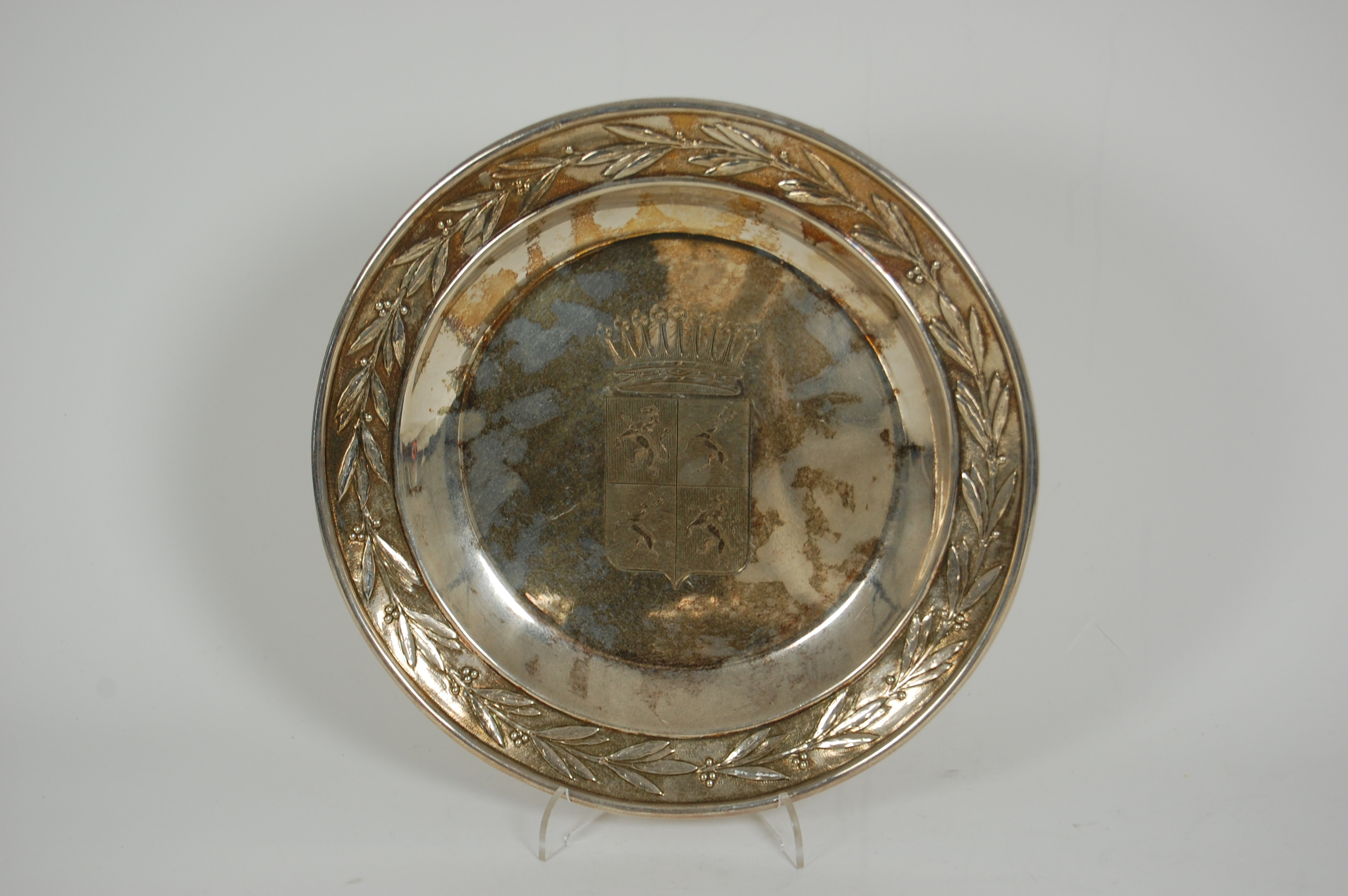 marked 'BEUGRAND' 'Peurs de s m l Empereur, Rue de la Paix 49', of circular outline which embossed laurel leaf border, the centre engraved with a coat of arms with crown above