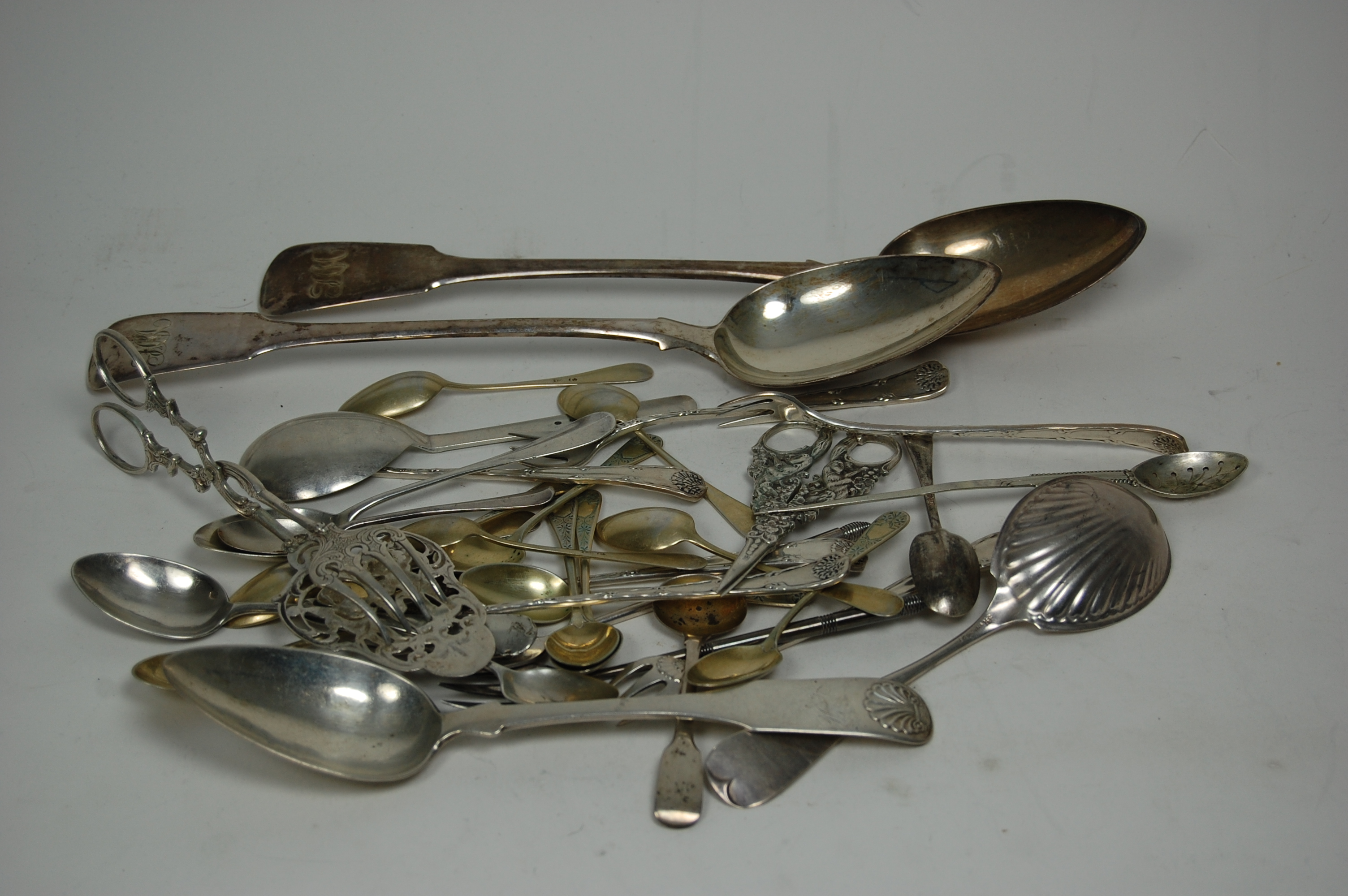 to include various table and tea spoons, condiment forks and a good pair of embossed serving tongs; together with a pair of George III London table spoons of Fiddle pattern (qty)