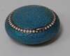 makers mark GK, of compressed form and circular outline with twisted wire coil chambers and blue ground enamel with white roundels border, the flush hinged cover with similar decoration