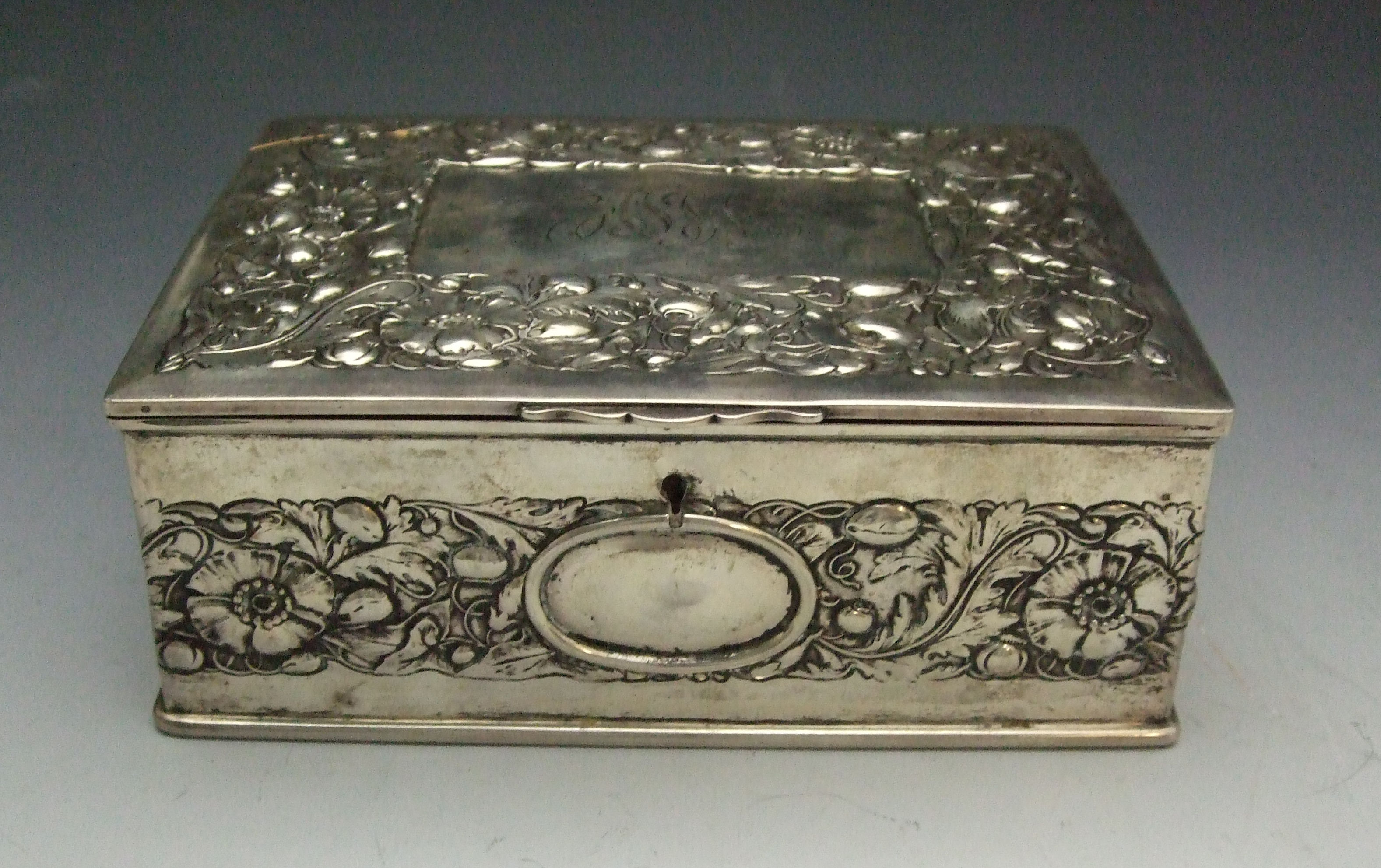 white metal, marked to base, the rectangular outline with embossed bands of poppies, fitted interior