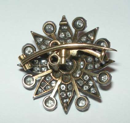of star form, with central floral cluster, set throughout with graduated old European and single cut diamonds, with detachable brooch fitting