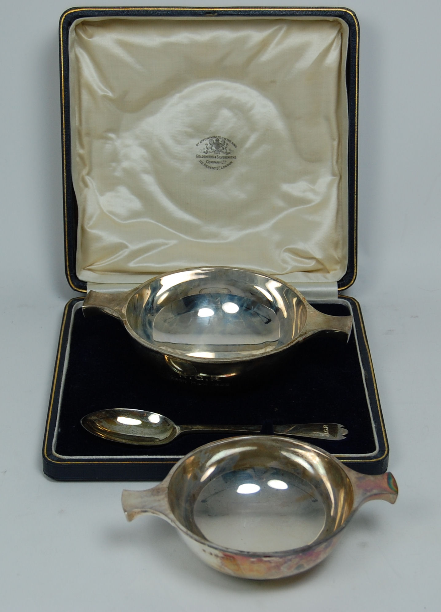 by Goldsmiths and Silversmiths Company, London 1928, of conventional form with two shaped lugs, in original fitted box with matching stylised trefid spoon; together with a smaller quaich of similar form by Wilson & Sharp (of Edinburgh) Birmingham 1926 (2)