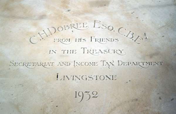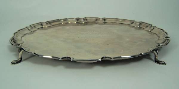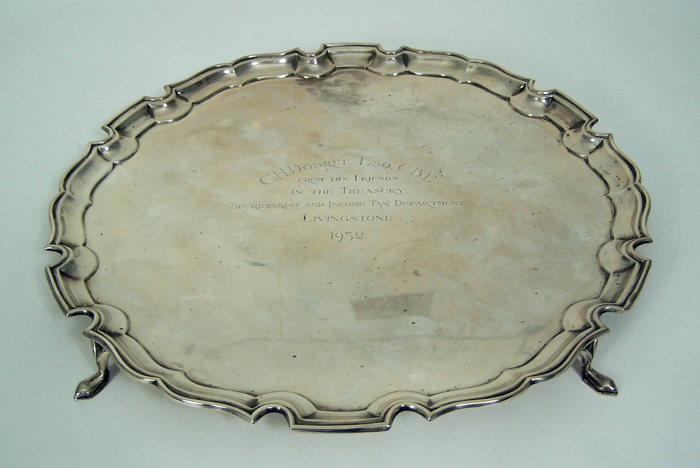 by Goldsmiths and Silversmiths Company, London 1932 of shaped circular outline with presentation inscription 'C H Dobree Esq CB from his friends in the Treasury Secretariat and income tax department Livingstone 1932', raised on four simple bracket feet