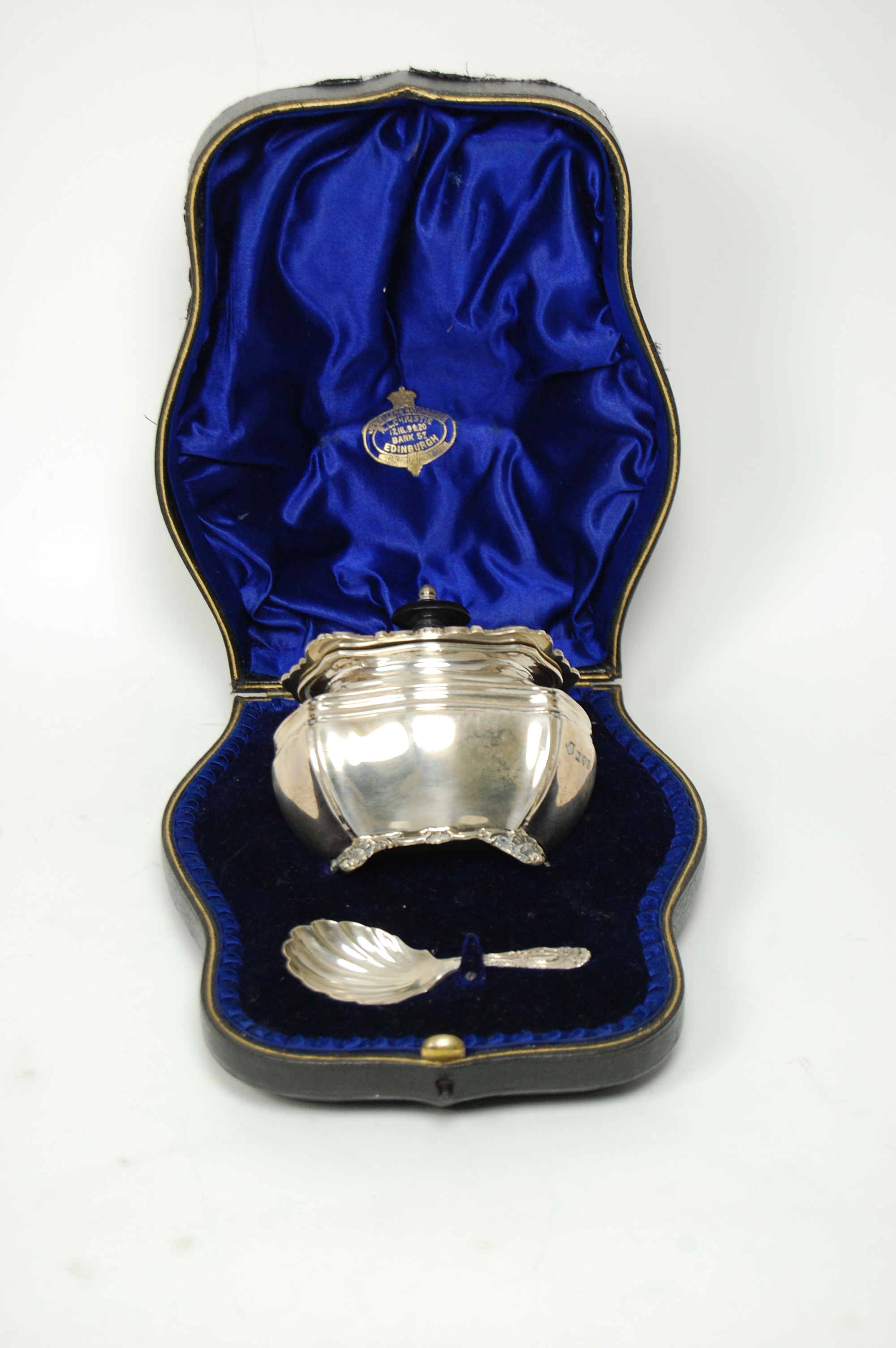 by D Jackson & D Fullerton London 1908, the caddy of baluster form with reeded girdle and everted moulded scroll and shell rim, with domed hinged cover, together with a shell bowl caddy spoon with scroll detailed handle, in original fitted case
