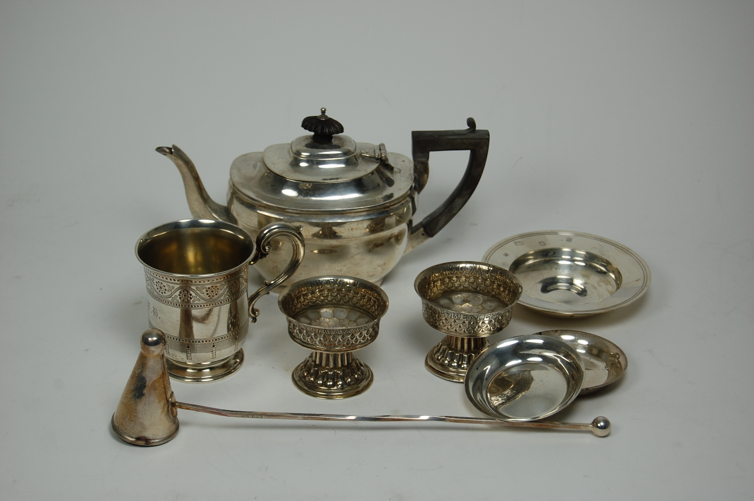 to include a bachelors teapot Chester 1918; a modern armada dish by R Comyns; a Victorian christening mug London 1862, with simple punched and engraved trailing foliate decoration and S scroll handle; a pair of capstan open salts, Chester 1903 in the George I manner with chased borders and decoration; together with a modern candle snuffer and a pair of simple butter dishes (qty)