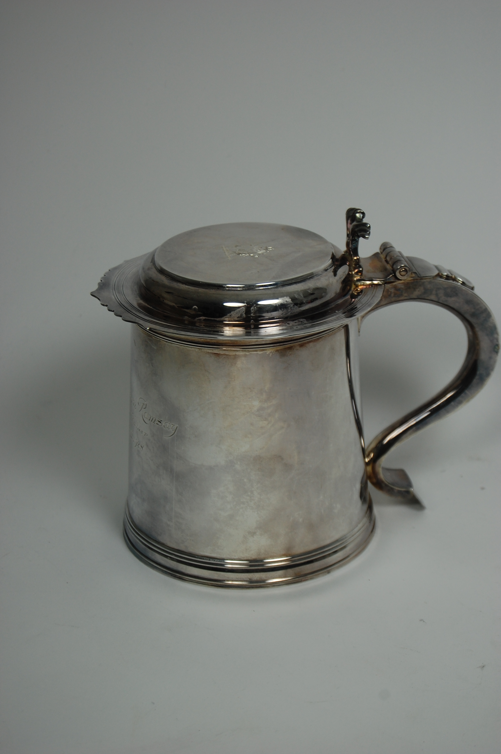 by Goldsmiths Company, London 1907, of conventional form with plain slightly flared body, engraved 'Neil Gordon Ramsay from his father....' on moulded rim, the hinged stepped cover with scroll thumbpiece and engrave crest, with S scroll handles