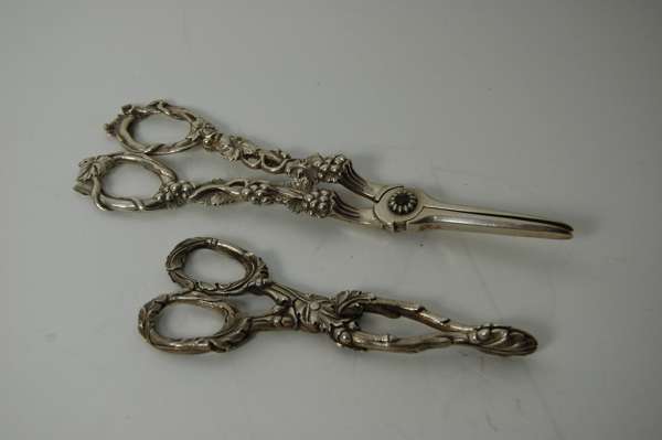 by Rawlins & Summers London 1836, of conventional form with cast intertwined fruiting vine handle and and plain blades, with engraved crest; together with a pair of cast William IV sugar nips Birmingham 1836 by Joseph Wilmore, with foliate and branch formed handles and arms with leaf formed bowls
