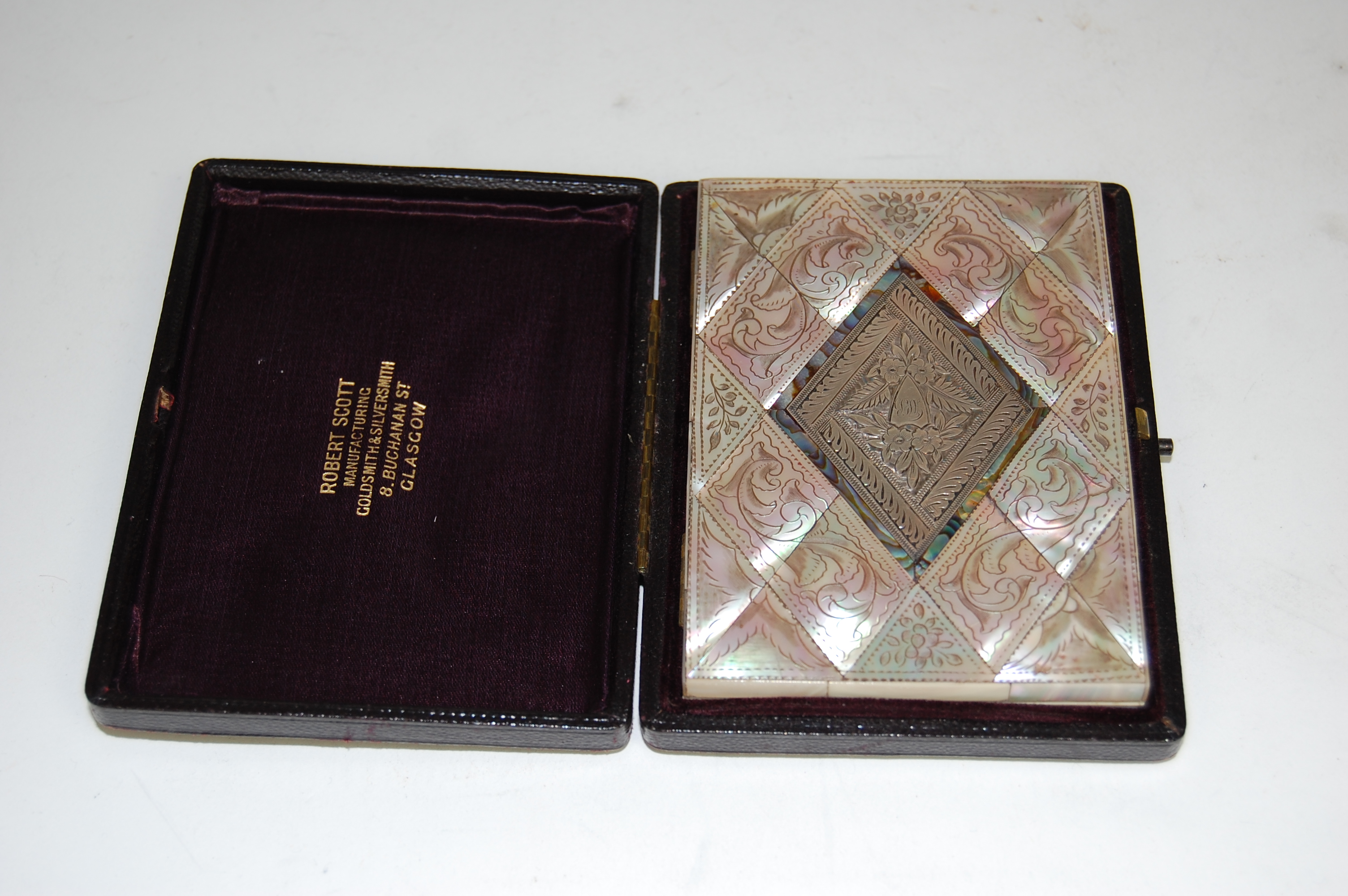 the case with mother of pearl diamond sections with engraved foliate and scroll, the central diamond silver cartouche with engraved borders and foliate design, bordered abalone, the blue paper interior with gilt edges with sectioned fittings, contained in original leather case inscribed to interior 'Robert Scott manufacturing goldsmith and silversmith 8 Buchanan St Glasgow'