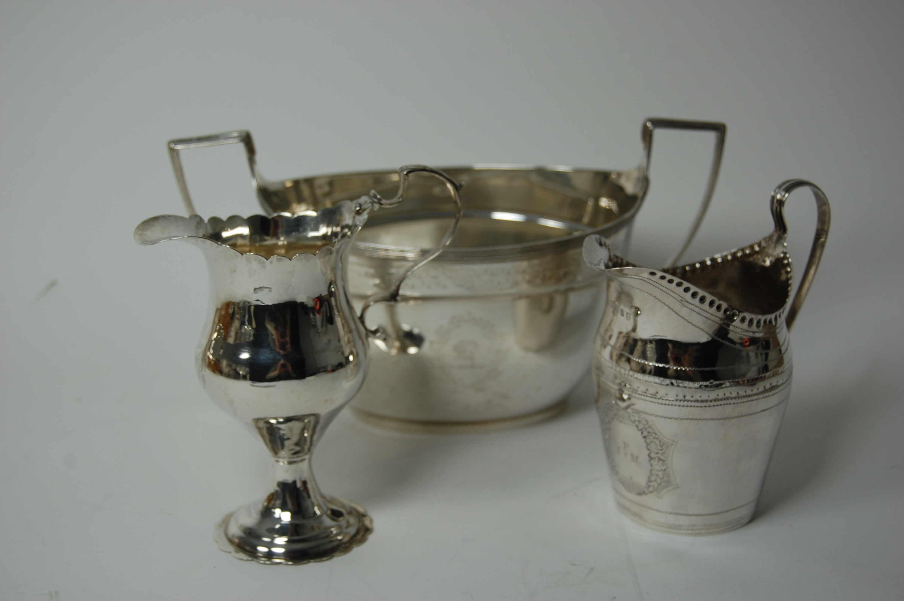 London 1785, of baluster form with scalloped rim, on simple waisted stem and domed foot, with S scroll handle with foliate thumbpiece; a George III helmet form cream jug, London 1796 with bright engraved border and cartouche and beaded rim, with simple scroll strap handle; together with a George III twin handled sugar bowl with indistinct London marks, of pointed oval outline with reeded borders and handles and with engraved details (3)