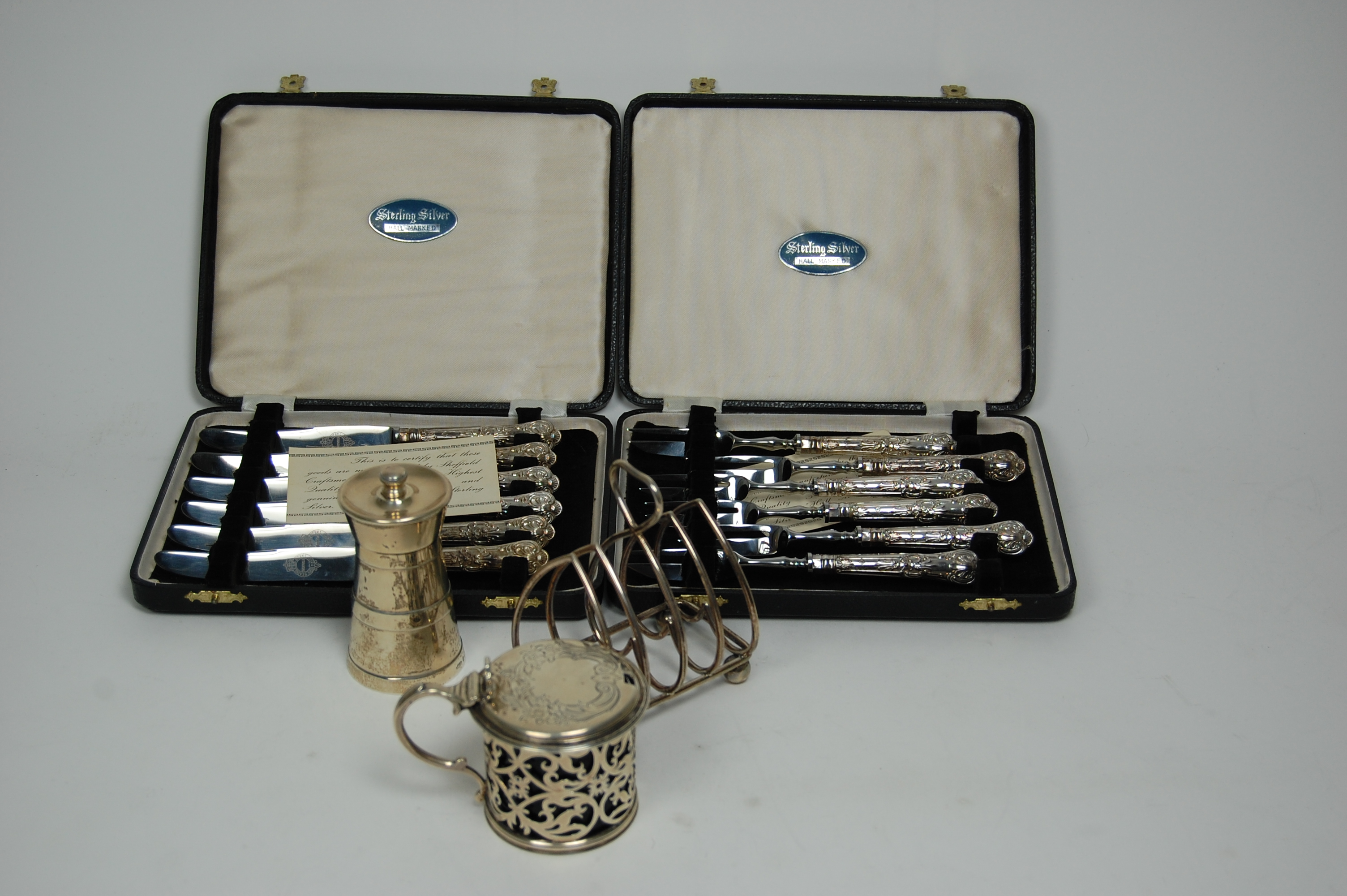 by J Evans London 1854, of drum form with pierced scroll work body with hinged flat cover with engraved border; together with a capstan pepper grinder, five bar heart formed toastrack and cased sets of six double struck King's pattern side knives and forks (5)