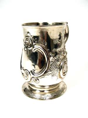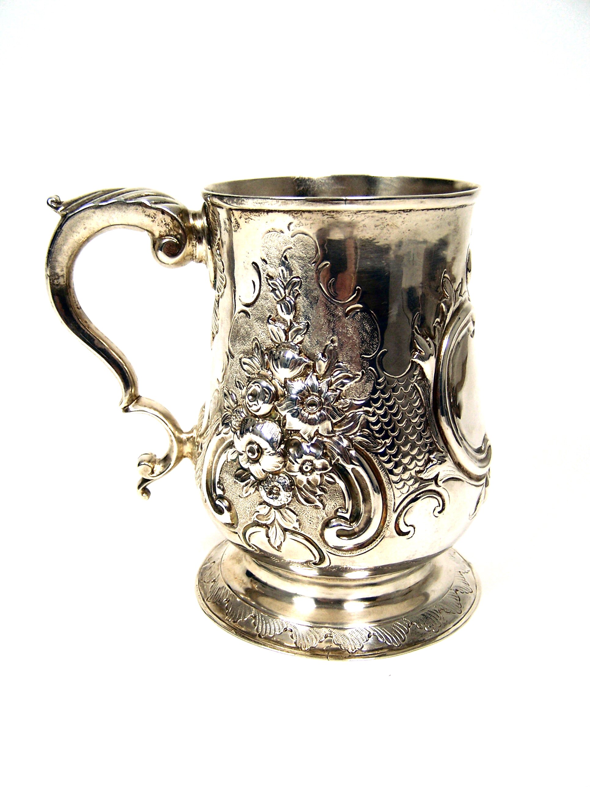 J King London 1789, of typical baluster form with later embossed flower head and scroll decoration with scroll formed cartouche, S scroll handle with foliate detail and raised on a simple spreading foot