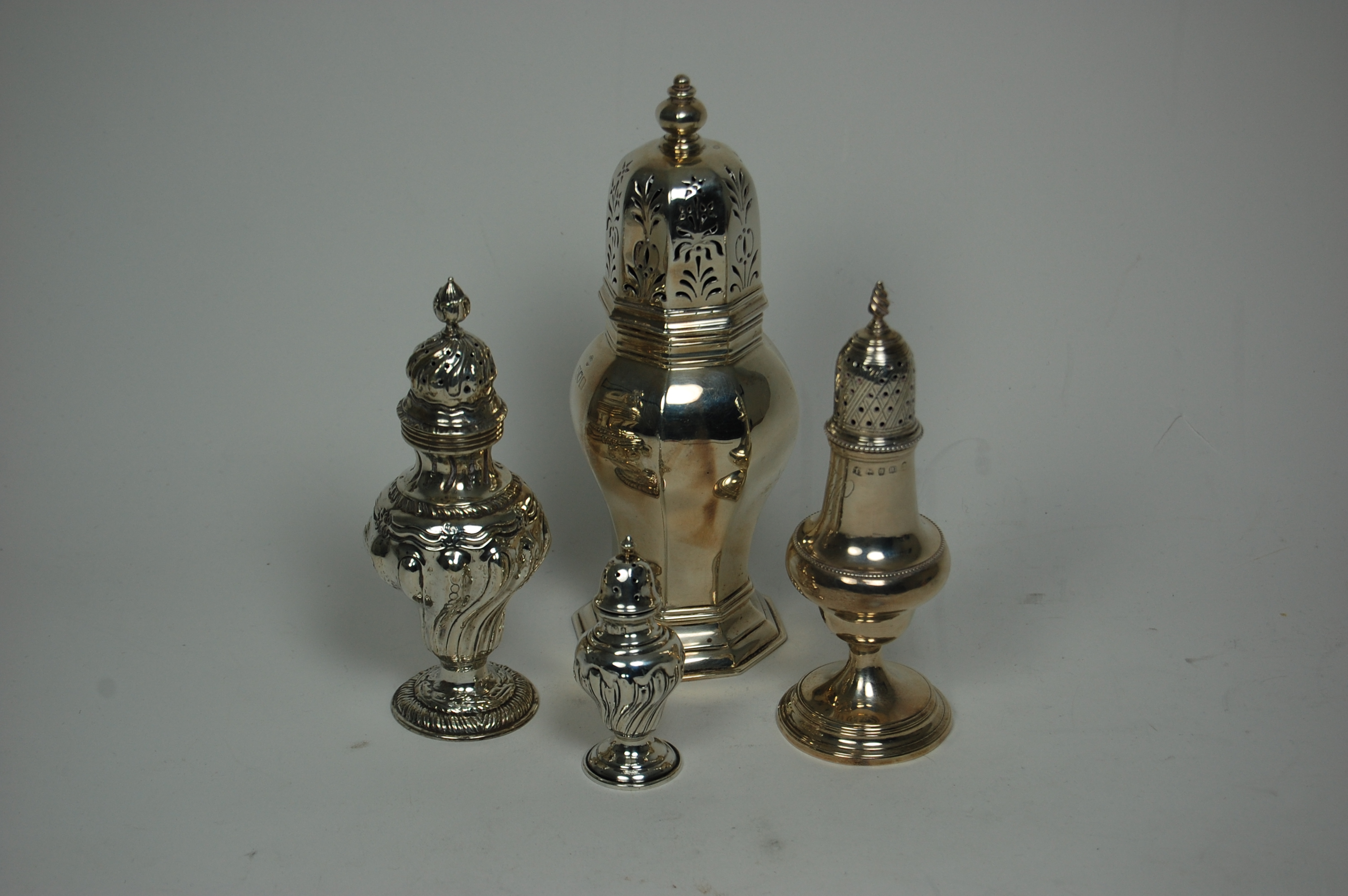 to include a George III 1827 example, of slender baluster form with fine beaded girdle, the domed pull off cover pierced and with simple engraving; a large panelled baluster example London 1904 and two smaller embossed and fluted examples (4)
