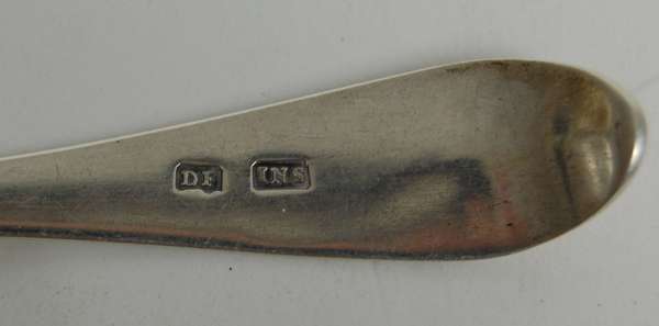 by D Fraser marked DF, INS, of Old English pattern with circular bowl and engraved gothic G to terminal; together with an Old English pattern teaspoon by Charles Jamieson Inverness marked CJ, J; a Fiddle pattern teaspoon by A Mcleod marked AMC, INS, device struck three times and a Fiddle pattern teaspoon by D Fraser (possibly) marked DF, Edinburgh 1830 (4)