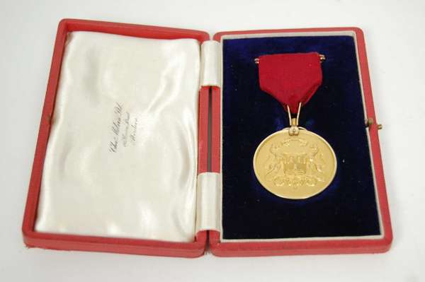 unmarked (but tests as 18ct gold), the obverse with coat of arms of Aberdeen with motto above, reverse with presentation inscription 'awarded by the Town Council of Aberdeen to J C Glennie ......' in original fitted box inscribed 'Chas Melvin Aberdeen'