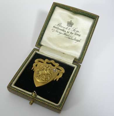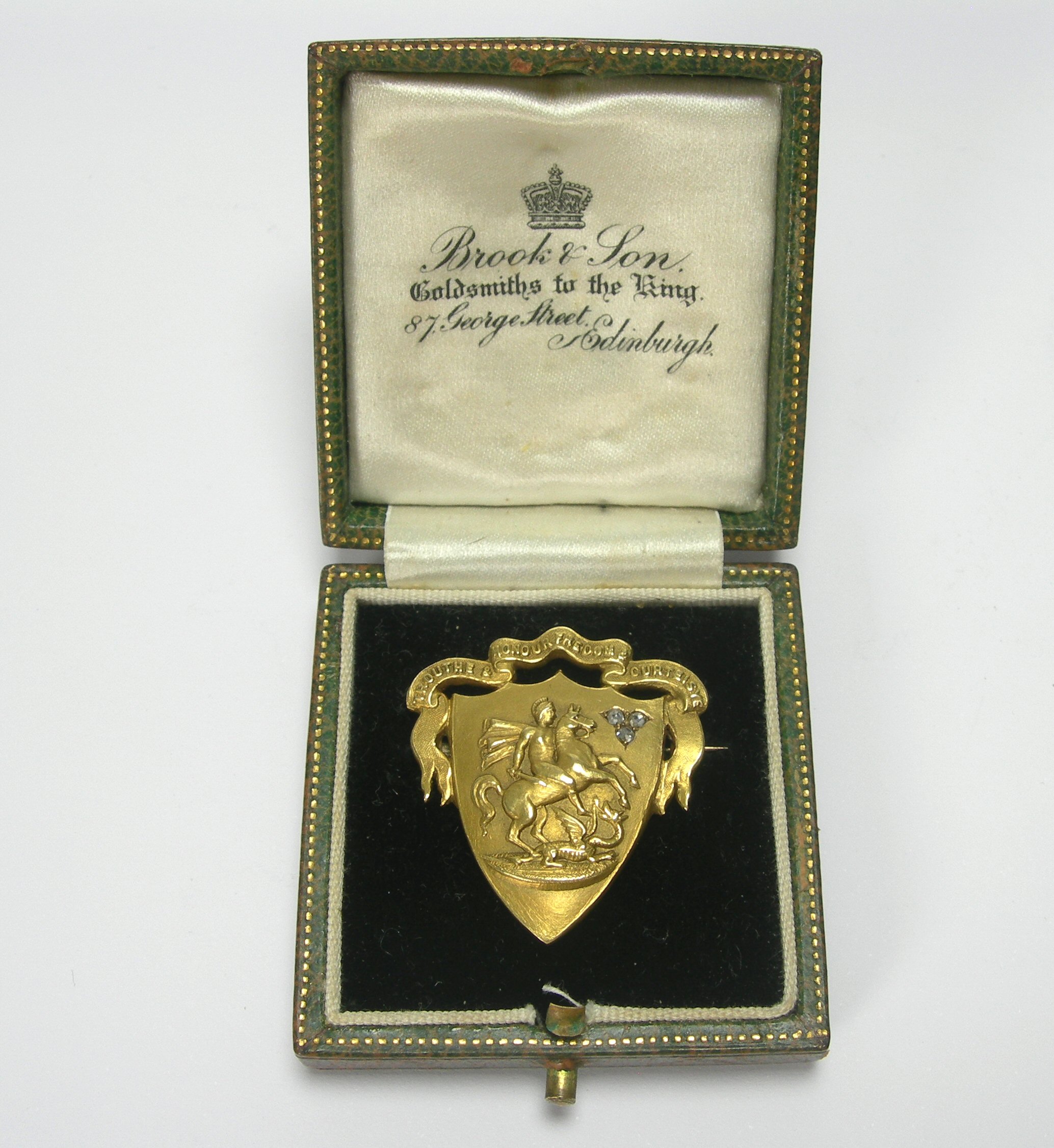 the edged shield cast with St George killing a dragon, set with three rose cut diamonds, witih scroll banner inscribed TROUTHE & HONOUR FREEDOM & CUIRTEISYE, engraved to the rear ...MACALISTER...1915...1924