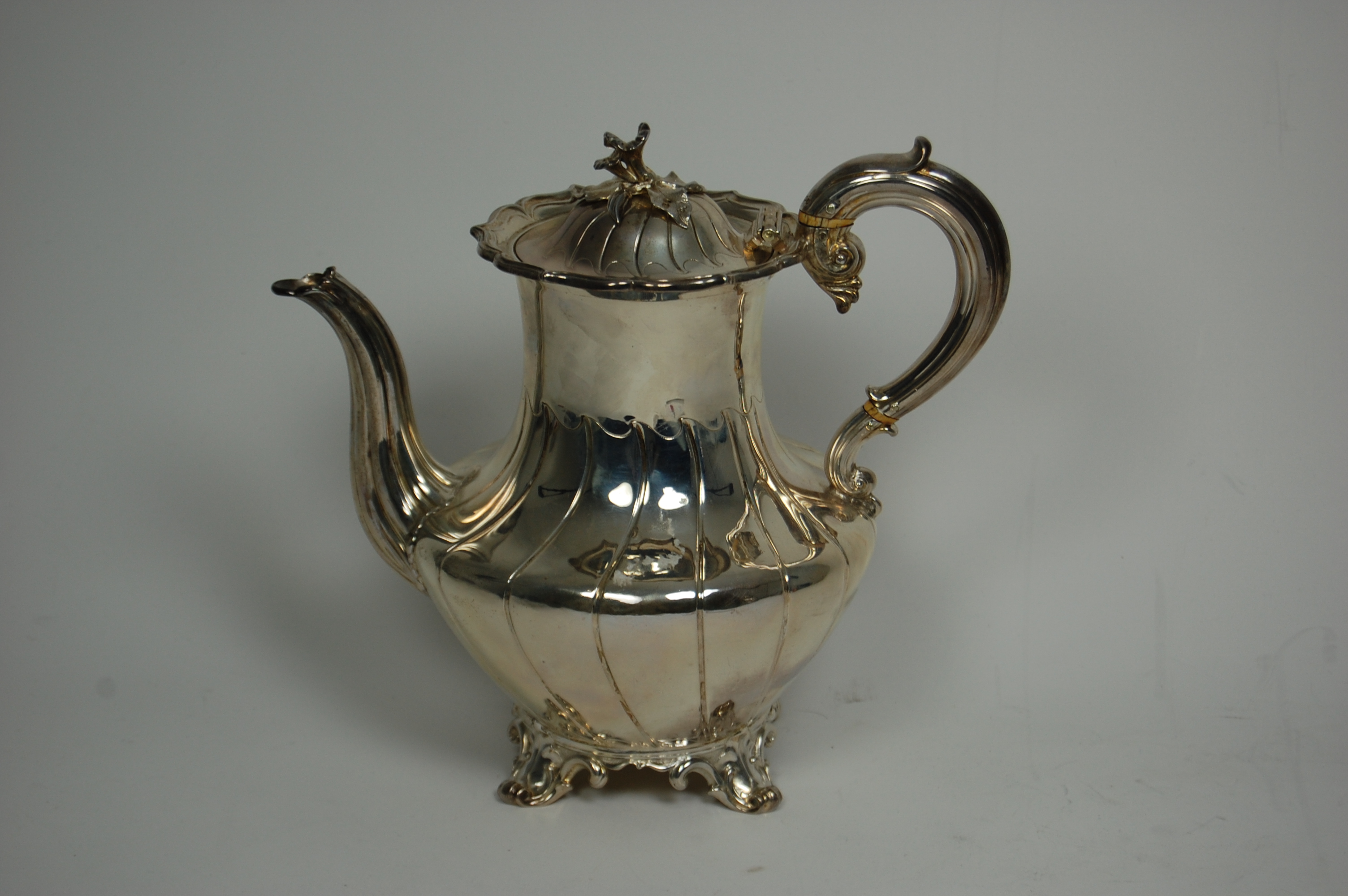 by the Barnards, London 1835, the baluster body with simple incised linear semi spiralling, with curved spout and hinged domed cover with flower head finials, raised on four bracket feet