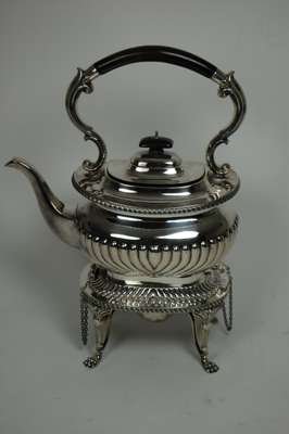 by RP, London 1907 the kettle with gadrooned lower section and simple curved spout, resting ion gadrooned frame with lift out buner raised on four pad feet