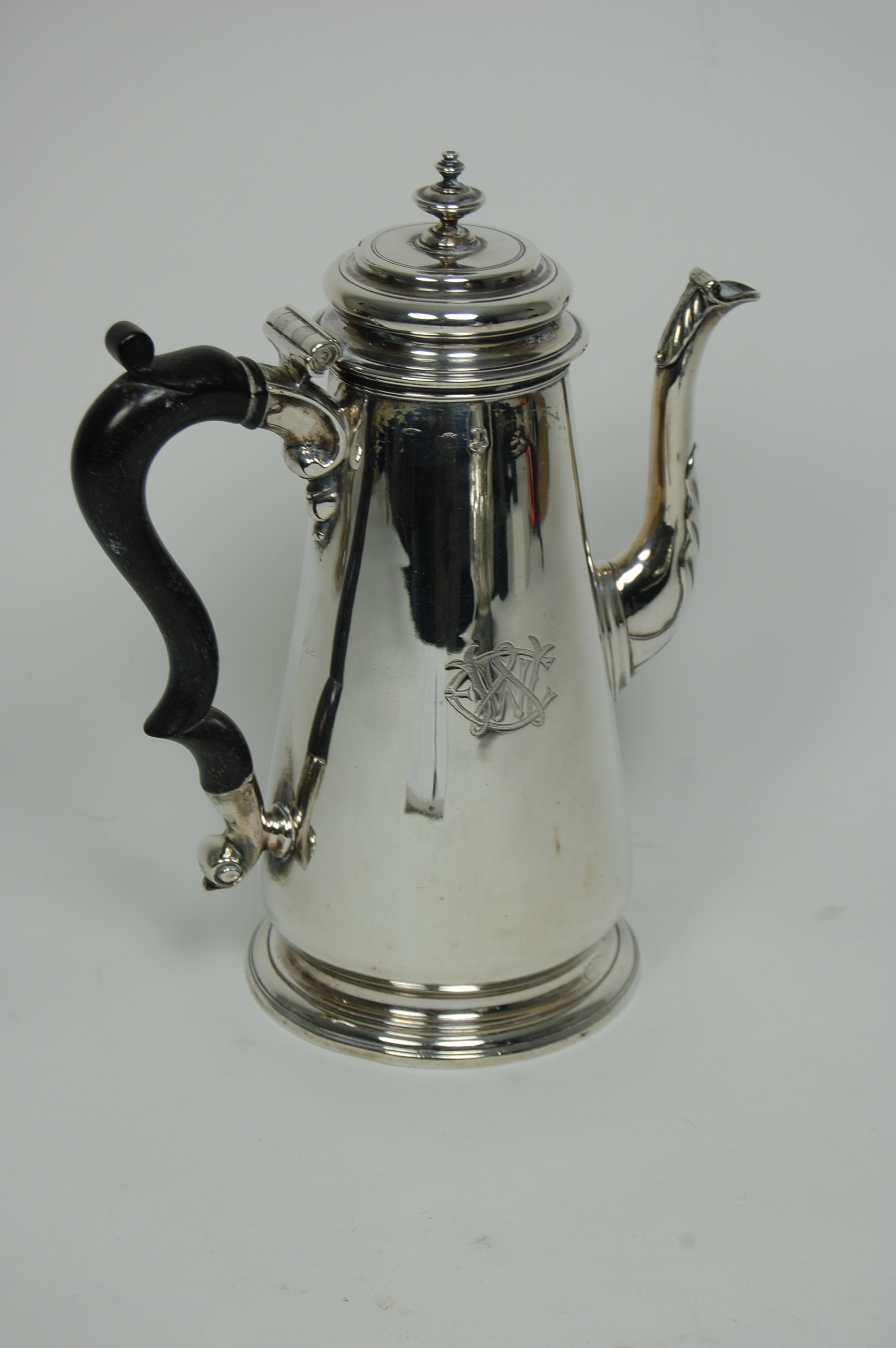 marks indistinct, of simple form with flared body and swan neck spout with acanthus detail, the domed hinged lid with simple finial and with S scroll wooden handle