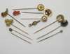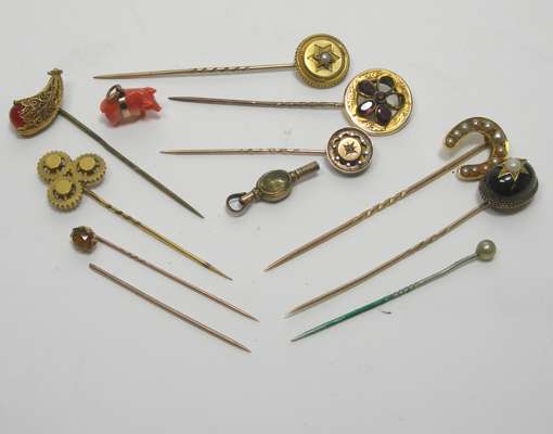 to include a stickpin with horseshoe shaped terminal set with graduated half-pearls; another star set with a rose cut diamond; garnet and pearl set examples; also a gem set watch key and a pig carved coral charm, contained in a fitted leather box (Qty)
