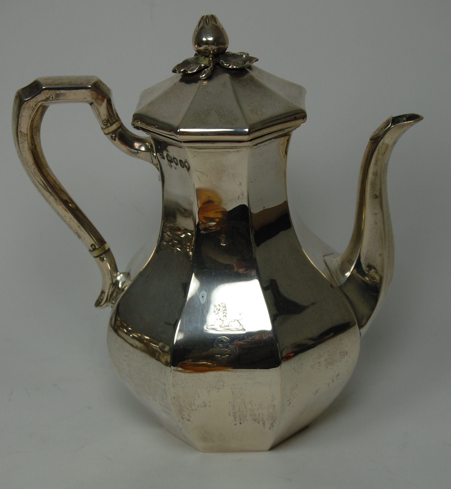 London 1861, of octagonal panelled form with slender baluster body and curved spout, the angular S scroll handle with ivory insulators, the domed panelled lid with bud finial