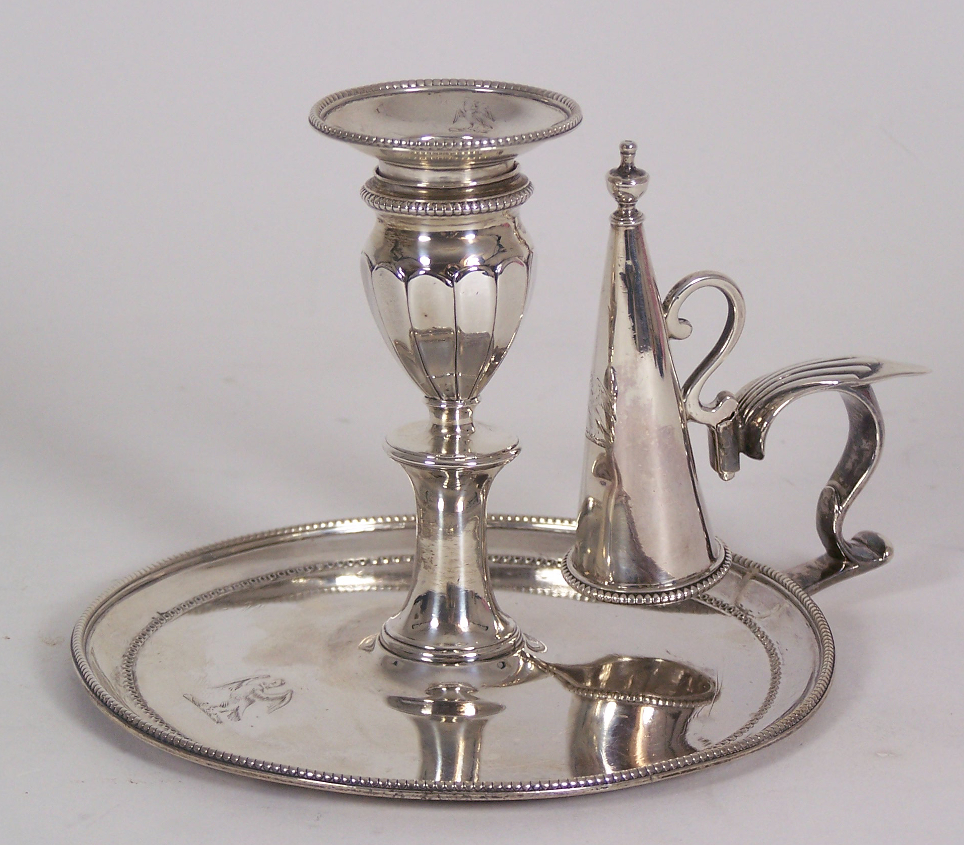 Robert Jones II London 1781, of conventional form with circular base with beaded upper rim and pierced lower rim, centrally set with sconce on waisted stem and with panelled socket, with S scroll handle supporting the conical snuffer
