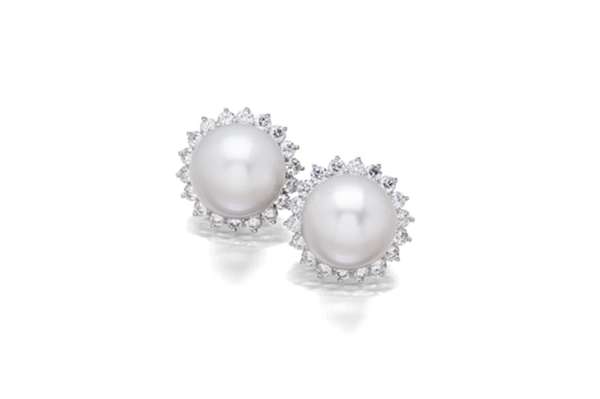 each centred by a large South Sea cultured pearl, measuring approximately 16mm diameter, within a surround of claw set round brilliant cut diamonds, with hinged clip fittings stamped PT950 750 ASLNY