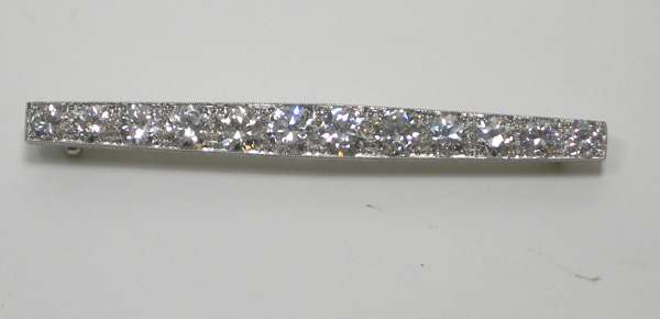 designed as a tapering bar, millegrain set with graduated round brilliant cut diamonds, with foliate scroll engraved sides
