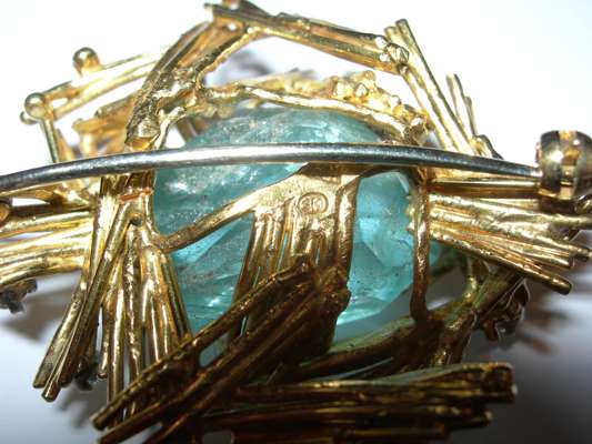 of asymmetric design, with central claw set aquamarine crystal, within a wirework surround set with round brilliant cut diamond highlights, stamped SK within an oval punch