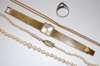 composed of pearls ranging from 3.5mm to 7mm diameter, with shaped oval multi-gem set clasp; a ropetwist link necklace, clasp stamped 750; together with a Longines lady's wrist watch, rear back stamped 18K, with champagne coloured square dial with gilt baton numerals and hands, fitted to a tapering interwoven bracelet with fold-over clasp (3)