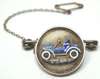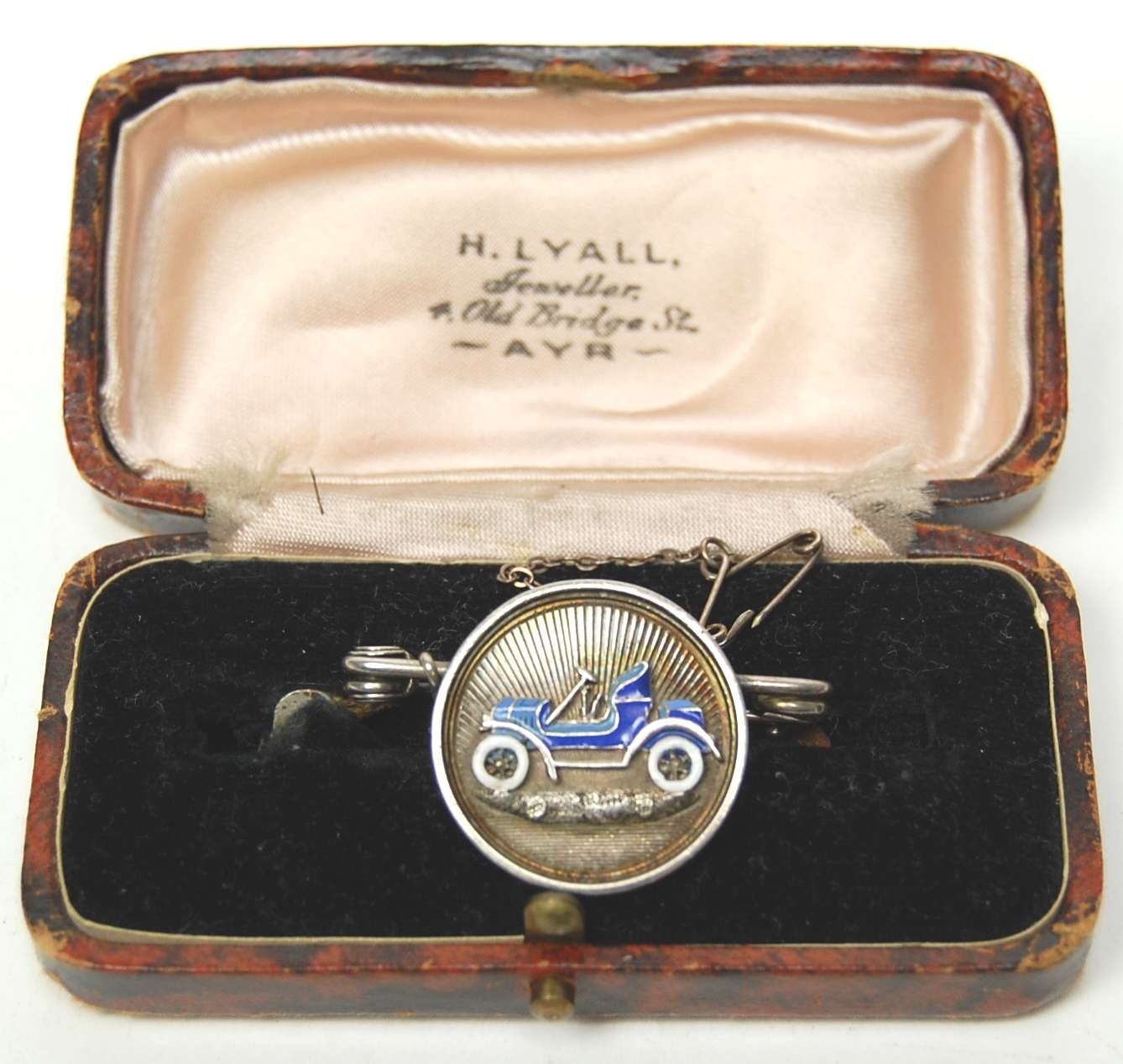 London 1905, the circular boss with enamelled car in two tone blue and white with engraved background, the reverse engraved 'British NCR motor race March 1906 EW Friday Personal Territory 176 points', on simple sprung pin bar brooch