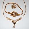 comprising necklace, bracelet and ring, each item stamped 750 and of open work design with plain and textured yellow gold and claw set with clear and blue pastes