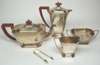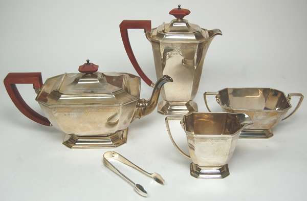 Aidie Brothers, Birmingham 1938, comprising teapot, coffee pot, twin handled sugar bowl and milk jug, of tapered form with canted corners with simple angular engraved corners; together with a pair of sugar tongs (5)