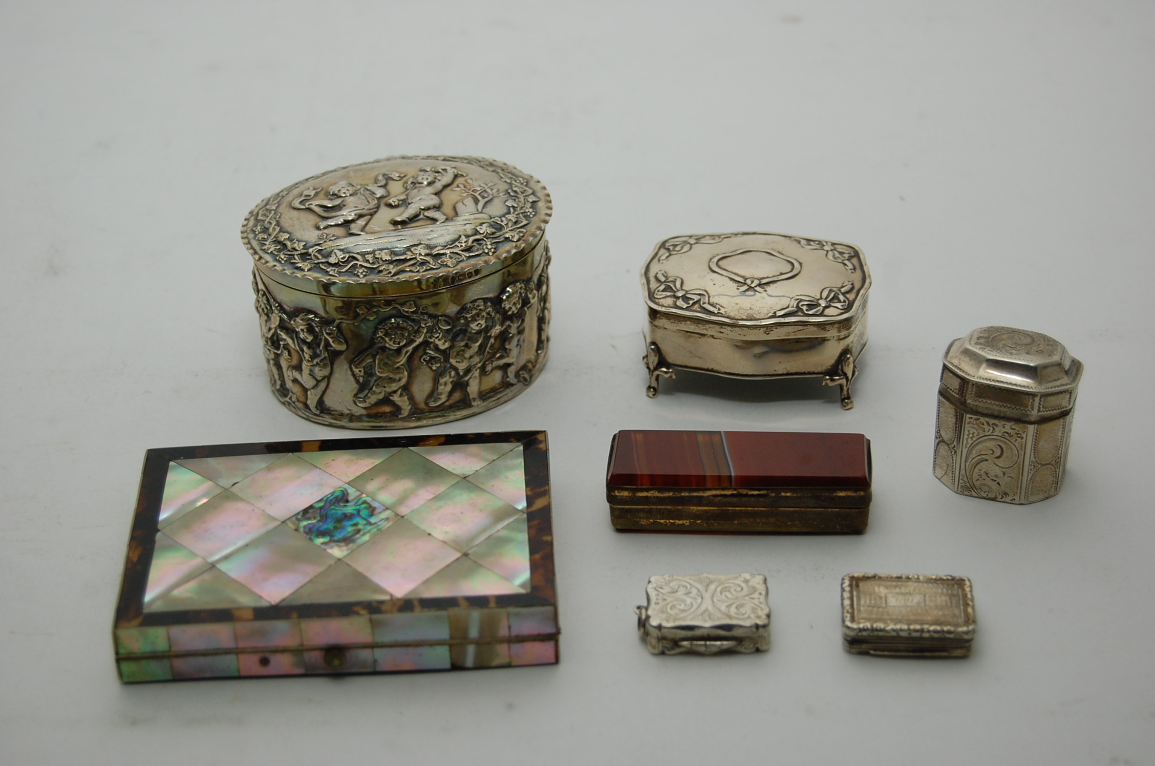 to include an embossed trinket box, Charles S Harris, London 1888, of oval outline with embossed scene of dancing cheurbs, the pull off cover similarly decorated; two vinaigerettes (both A/F); an agate vesta box with gilt metal mountd; a mother of pearl and tortoiseshell visiting card case; together with two other trinket boxes (7)