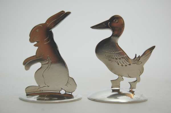 by S Morden & Co Chester 1911, formed as a rabbit and a duck with engraved detail, raised on simple domed bases, the bases additionally signed 'Benjamin Rabier' (2)