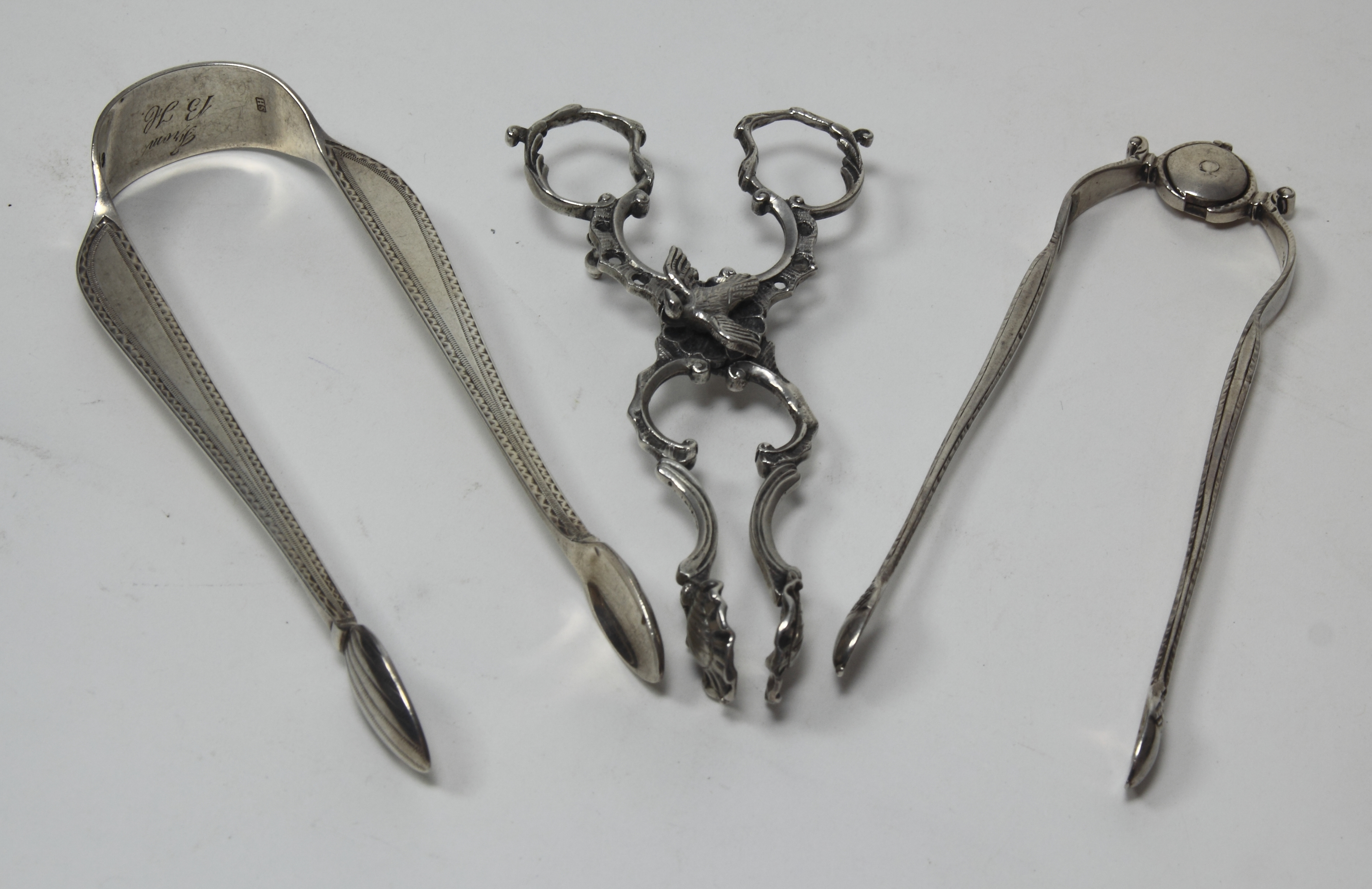 in the form of a harlequin apparently unmarked, a pair of cast rococo sugar tongs with openwork arms and scroll formed legs and loop handles, apparently unmarked; a pair of George III sugar nips, marked LM, and lion passant, with engraved initials B.C, of typical from with shell bowls; a similar pair of George II sugar nips makers mark RM; together with a George III pair of typical form, unmarked; together with three pairs of sugar tongs with bright cut engraving (8)