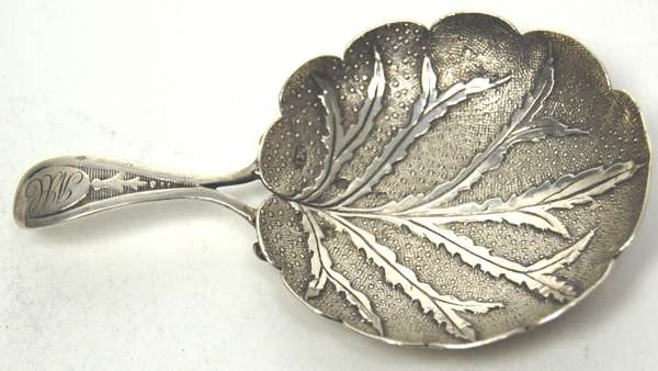 M Linwood & Sons, Birmingham 1808, the scalloped circular bowl with foliate detail with a simple Old English pattern handle with engraved detail