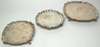 London 1902, of simple shaped circular form with raise border, and armorial engraved to centre, raised on three scroll feet; a pair of graduated modern card trays retailed by Harrods, London 1935, of shaped square outline on four ball and claw feet (3)