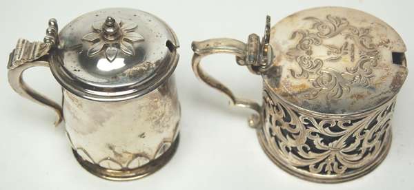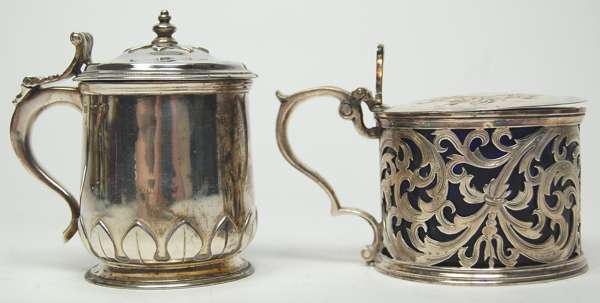 by the Barnards, London 1837, of typical drum form with pierced and engraved scroll work, the domed hinged cover with similar chased detail; together with another mustard pot by Hamilton & Inches (of Edinburgh), with obscured Sheffield marks, of simple slight baluster form with cut card applied decoration and domed hinged lid (2)