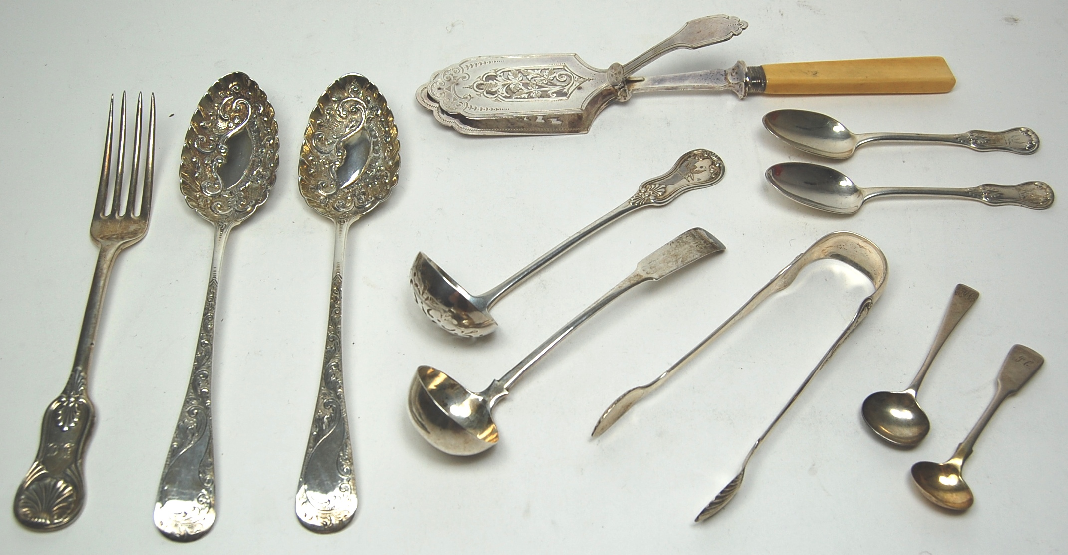 to include various items including double struck King's pattern toddy ladles, table forks; a pair of berry spoons, salt spoons, teaspoons etc (qty)