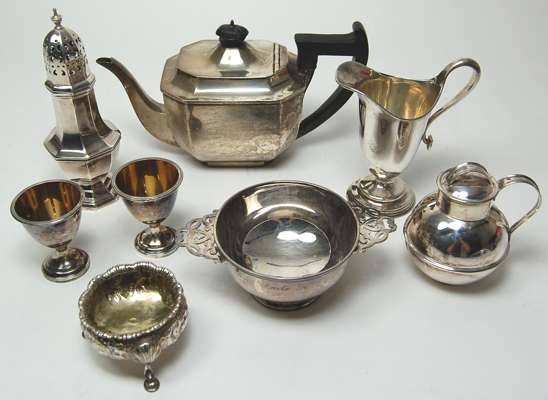 by Nathan & Hayes, Birmingham 1900, of small conventional form with pull off cover and simple loop handle, the base with additional retailers stamp 'ROGER SILVERSMITH GUERNSEY'; together with other small items to sliver to include a quaich with pierced handles, a pair of egg cups, a helmet formed cream jug, sugar caster, bachelors teapot and an open salt (7)