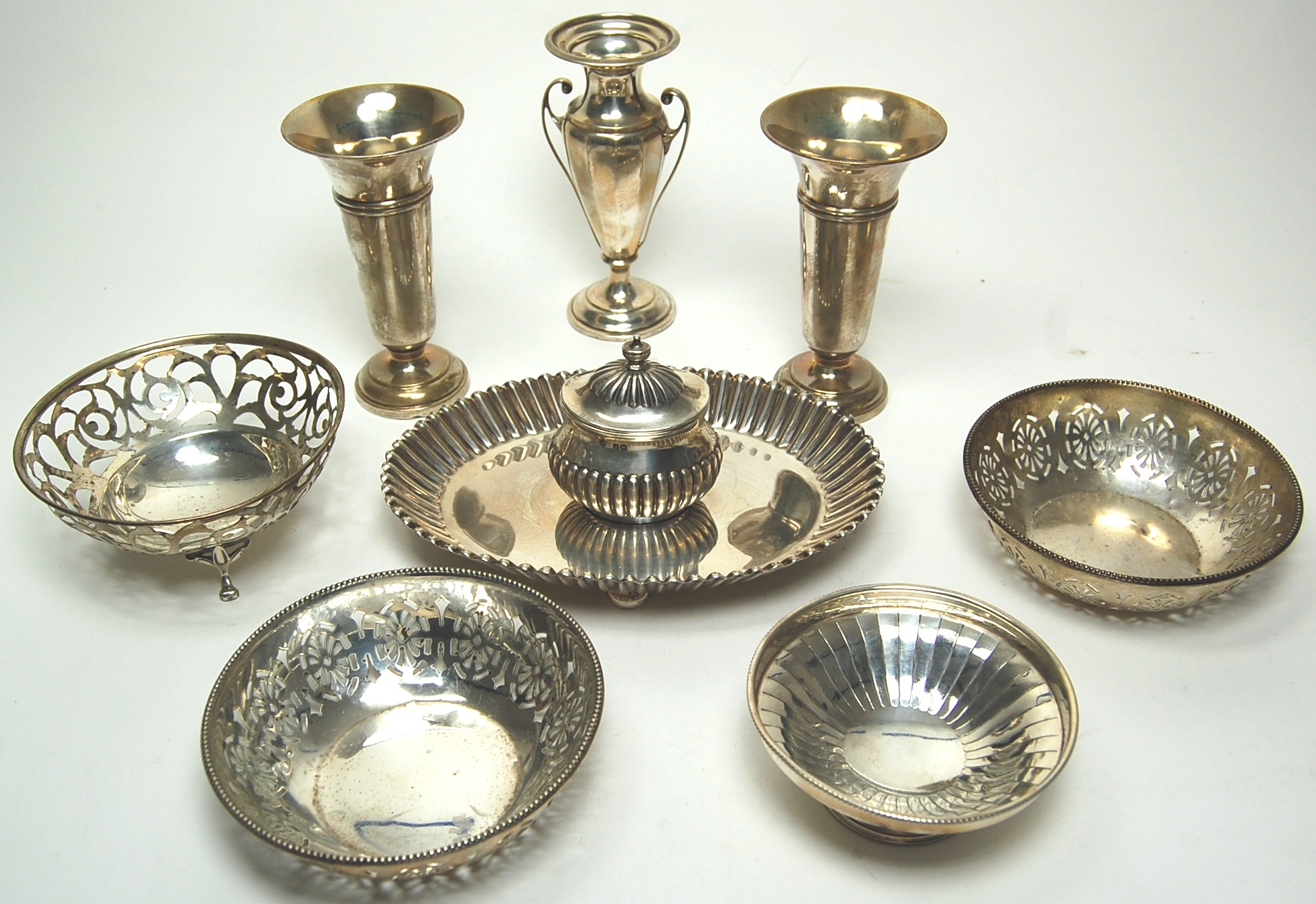 Martin & Hall Sheffield 1893, of oval tray with fluted border centrally set with baluster inkwell with hinged cover; together with three spill vases and a small collection of pierced bowls (8)
