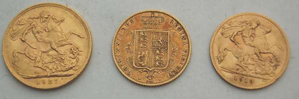 SA mint, GVF; together with a 1913 half sovereign, 1873 half sovereign (die 211) (3)